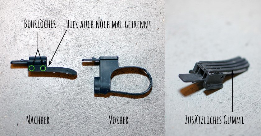 Da dazu immer mal wieder Fragen kamen: Es handelt sich hierbei um eine Halterung einer Mini-Fahrradpumpe. Das Modell habe ich noch einmal rausgesucht: SKS Cross-Grip Multiposition Clip. Zur Befestigung am Rahmen habe ich allerdings Kabelbinder genommen. Da diese Befestigung wenig flexibel ist, muss der Akku natürlich direkt passen. Mit dem oben genannten Akku zusammen passte es bei mir auf jeden Fall sehr gut.